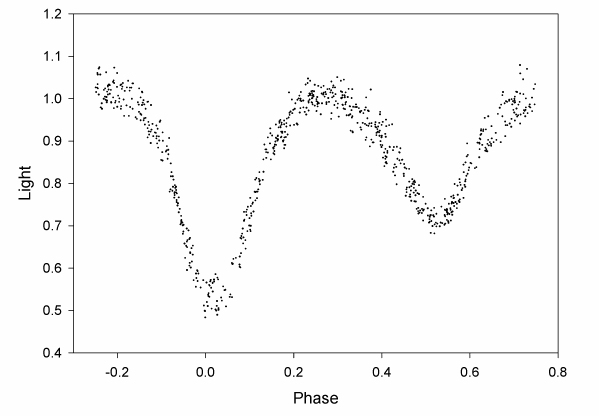 The two following figures show the observed visual lightcurve of the eclipsing binary, Beta Lyrae. This system consists of two stars, one that is a giant star, about 15 times larger than the Sun, which is vigorously losing mass to another star that we cannot see directly. The mass transfer is so great, that a swirling disk of gases form around the other star. This disk is rather tall, about 12 times the size of the sun, and since we see the disk very nearly from the side, the star at the center of the disk is entirely hidden from our Earthbound view.