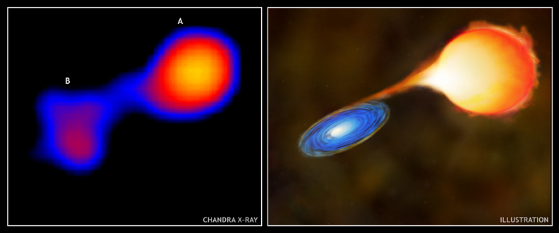 Using the Japenese X-ray satellite Suzaku, collaborators and I have observed Beta Lyrae in X-ray light. The following is an image of Mira, a different star but also a binary, as observed in X-ray light using the NASA Chandra telescope (left), along with an artistic illustration of the binary system (right).