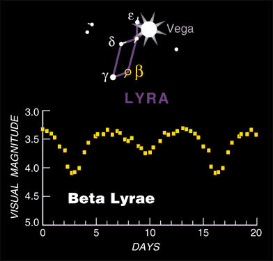 The first figure shows how the light from Beta Lyrae changes over its approximately 14 day orbital period. There are two eclipses: a deeper one when the more luminous giant star is partially blocked by the disk, and a less deep one when the giant star blocks the light from the glowing disk. (Also shown is where Beta Lyrae is located in the constellation of Lyrae, where for reference the bright star Vega is also shown.) The figure below this is the same lightcurve, but plotted differently. The first lightcurve shows the brightness of Beta Lyrae is "magnitudes", which is a system of brightness used by astronomers. The second one is a little easier to read. The lightcurve is plotted in relative brightness. For example, the big deep indicates that the system becomes half as bright when the giant star is eclipsed, and but about 70 percent as bright when the disk is eclipsed.