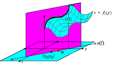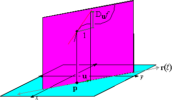 intersection of the vertical plane through the line r(t) = p+ut and the surface z = f( x,y) . In